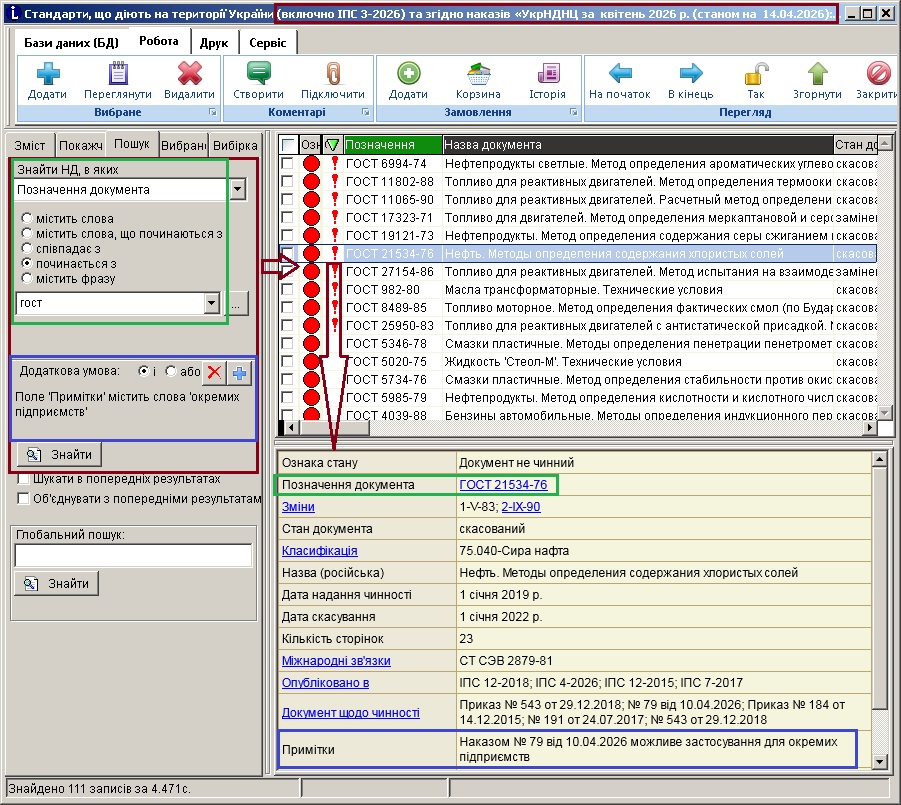 Знайти НД, в яких «Позначення документа» починається з «ГОСТ» і одночасно вибрати додаткову умову, вказавши що реквізит «Примітки» має містити слова «окремих підприємств»